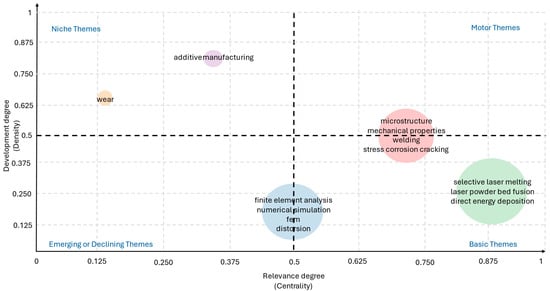 The upper-left quadrant, Niche Themes, contains more specialized or isolated lines of research, such as additive manufacturing and wear. These themes exhibit high density but lower centrality, meaning they are well developed within themselves but less connected to other research clusters. Their appearance in this quadrant suggests a concentration of detailed investigations that, while technically advanced, remain peripheral in terms of broader field influence.