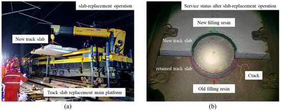 Slab-replacement operation of CRTS I slab ballastless track: (a) diagram of slab-replacement operation; (b) structural differences and damage after slab-replacement operations.