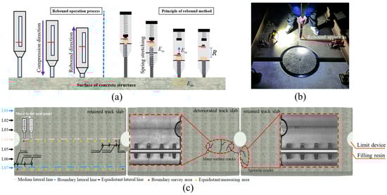 Apparent strength characterization test of the track slab: (a) the apparent strength is detected by the rebound tester; (b) schematic diagram of the rebound method; (c) layout of the apparent strength measurement of the track slab.