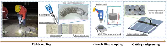 The preparation process for cylindrical specimens of the old filling resin is illustrated in Figure 3. Prior to the slab-replacement operation, the old filling resin adjacent to the track slabs slated for replacement was chiseled off. Intact semicircular resin samples were retrieved from the construction site. Due to the curvature and concave surface of these semicircular specimens, they could not be processed into standard cubic specimens in accordance with the “Provisional Technical Specifications for Polyurethane Resin for Convex Stops” [42]. Consequently, a core drill with a diameter of 50 mm was employed to extract cylindrical cores from the old filling resin. During the drilling process, the core-drilling machine was securely positioned on the surface of the resin samples. To ensure uniform height-to-diameter ratios among the specimens, a sliding saw was used to trim the cores to the desired height. The final cylindrical specimens of the old filling resin measured 50 mm in diameter and 25 mm in height. Prior to conducting the elastic modulus tests, the specimen surfaces were cleaned thoroughly, and their top and bottom faces were ground flat and smooth using a precision grinding machine to ensure surface evenness and quality.