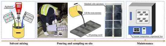The casting procedure for standard cubic specimens of the new filling resin is depicted in Figure 4. The resin was prepared by combining solutions A and B in a 1:20 weight ratio. In accordance with the “Provisional Technical Specifications for Polyurethane Resin for Convex Stops” [42], a casting mold with cavity dimensions of 100 mm × 100 mm × 25 mm was fabricated via 3D printing. The mixed resin solution was poured into the mold on-site and allowed to cure until fully solidified. The specimens were then demolded and conditioned for 28 days in an environment maintained at 23 °C ± 2 °C and 50% ± 10% relative humidity.