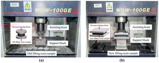 Experiment on the elastic coefficient of new and old filling resins: (a) experimental setup for elastic coefficient of cylindrical filling resins; (b) experimental setup for the elastic coefficient of standard cubic filling resin.