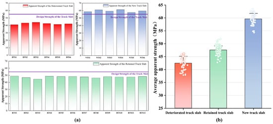 Statistical chart of the apparent strength of the track slab: (a) statistics of apparent strength of track slabs in different service states; (b) average apparent strength of track slabs in different service states.
