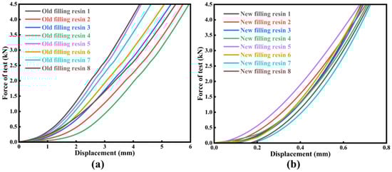 Figure 7 presents the load–deformation curves obtained from elastic-modulus tests on the new and old filling resin specimens. During each formal test, the deformations corresponding to applied loads of 1 kN (P1) and 4 kN (P2) were recorded. Within the proportional limit, the ratio of applied load to the corresponding deformation defines the elastic modulus, E, which was calculated according to Equation (1):