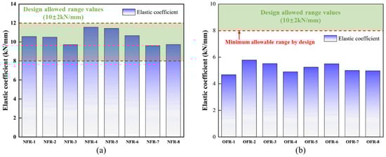 The elastic coefficients obtained from the elastic modulus tests on the aged cylindrical resin specimens were substituted into Equation (5) to calculate the corresponding values for standard cubic specimens. According to the statistical analysis of the elastic modulus of the new filling resin (NFR) and the old filling resin (OFR) as presented in Figure 8, the old filling resin’s stiffness is markedly below the allowable range of 8.00 to 12.00 kN/mm. The minimum value measured for the old filling resin was 4.67 kN/mm, which is 41.63% below the lower design limit, and its mean value was 5.19 kN/mm, 35.13% below that limit. In contrast, the elastic coefficients of the new filling resin conform to the specified range: the maximum reached 11.57 kN/mm, 44.64% above the lower limit, and the mean was 10.48 kN/mm, 31.00% above the lower limit.