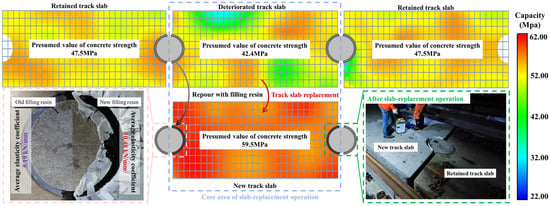 - Before the slab-replacement operation, the estimated concrete strength of the deteriorated track slab was 42.4 MPa, which is 10.74% lower than that of the adjacent retained track slab. After the slab-replacement operation, the estimated concrete strength of the new track slab was 59.5 MPa, 25.26% higher than that of the adjacent retained track slab. Regardless of the slab-replacement operation, the region exhibited uneven strength, which contributes to stress concentration issues.
