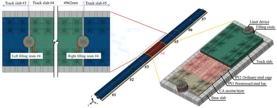 Specifically, before the slab-replacement operation, the material properties of Track Slab #4 were assigned based on the parameters of the deteriorated slab, while the filling resin on both sides was modeled using the properties of the old filling resin. After the slab-replacement operation, Track Slab #4 was updated with the material parameters of the new track slab, and the adjacent filling resin was modeled using the properties of the new filling resin. For the remaining track slabs and filling resin, the material properties were assigned based on the parameters of the retained track slab and old filling resin, respectively.