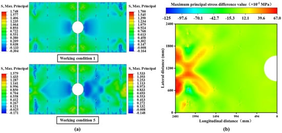 Overall cooling and positive temperature gradient coupling conditions: (a) cloud maps of the maximum principal stress distribution in conditions 1 and 5; (b) cloud diagram of stress changes in the retained track slab before and after slab-replacement operation.