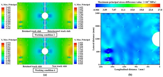 Overall cooling and negative temperature gradient coupling conditions: (a) cloud maps of the maximum principal stress distribution in conditions 2 and 6; (b) cloud diagram of stress changes of retained track slab before and after slab-replacement operations.