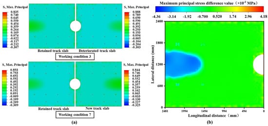 Coupling conditions of overall temperature rise and positive temperature gradient: (a) cloud maps of the maximum principal stress distribution in conditions 3 and 7; (b) cloud diagram of stress changes in the retained track slab before and after slab-replacement operation.