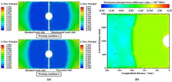 Coupling conditions of overall temperature rise and negative temperature gradient: (a) cloud maps of the maximum principal stress distribution in conditions 4 and 8; (b) cloud diagram of stress changes in retained track slab before and after slab-replacement operation.