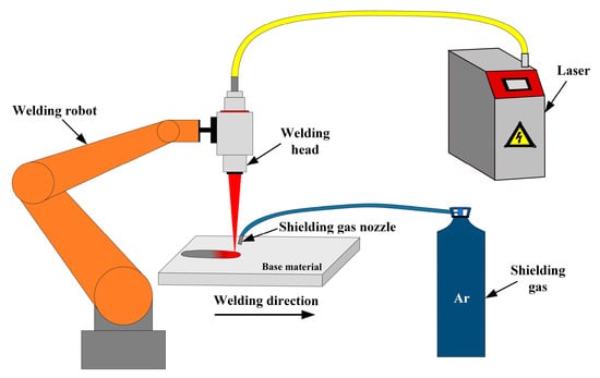 The laser welding processes of aluminum alloy under the conditions of the different welding process parameters are achieved by the welding system. The welding system is composed of the laser, welding head, welding robot, shielding gas nozzle and so on. The wavelength of the laser is 1064 nm and the welding head is fixed on the welding robot. During laser welding process, the argon gas with the flow rate of 20 L/min is used as the shielding gas to protect the welding zone. The schematic diagram of the welding system is shown in Figure 1.