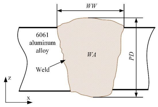 where , , and are the minimum x coordinate, maximum x coordinate, minimum z coordinate and maximum z coordinate of the image segmentation result, respectively. is the number of pixels located in the weld zone. is the actual length of one pixel in the metallographic image of weld.