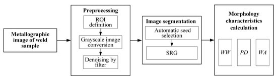 The flow chart of weld morphology characteristics extraction is shown in Figure 3. The metallographic image of the weld is preprocessed through region of interest (ROI) definition, grayscale image conversion and denoising by filter. Then, the automatic seed selection is performed and the seeded region growing (SRG) algorithm [17] is applied for segmentation. Based on the processed image, the weld morphology characteristics including the WW, PD and WA are calculated.