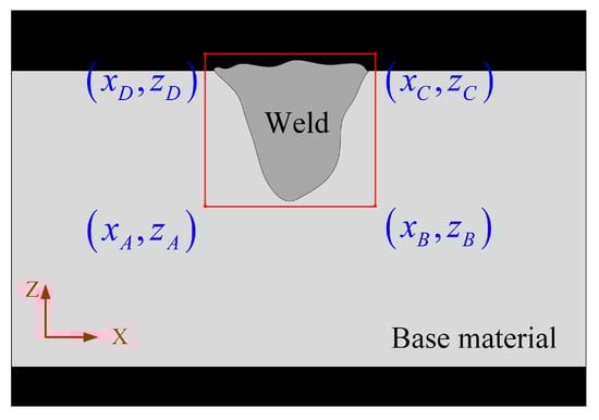 where points A, B, C and D are the bottom-left point, bottom-right point, top-right point and top-left point of the ROI, respectively. , , and are the x coordinates of points A, B, C and D, respectively. , , and are the z coordinates of points A, B, C and D, respectively. and are set according to the metallographic image of weld sample. w is the width of the ROI and h is the height of the ROI.