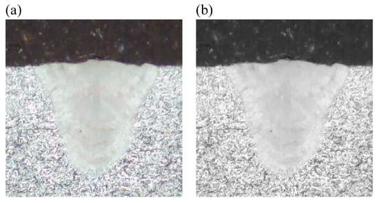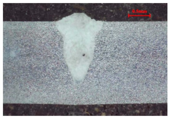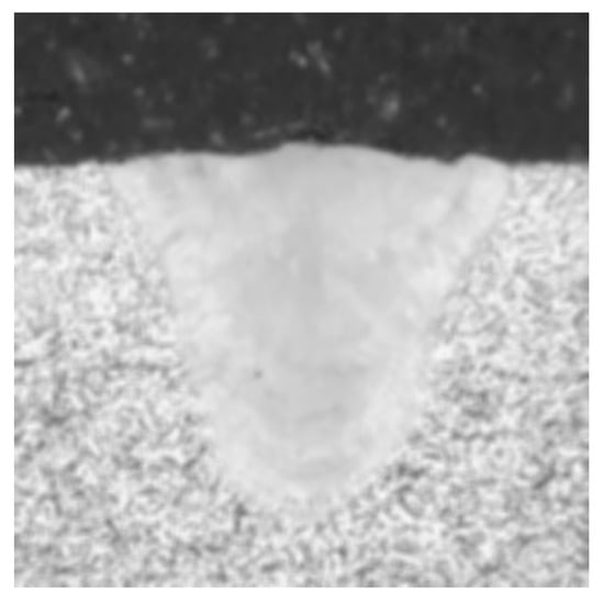 Based on the weld morphology characteristics extraction process, the weld morphology characteristics of twenty-five metallographic images of weld samples are extracted. Taking the cross-section metallographic image of the weld sample from the No. 4 group of the experiment (LP 700 W, WS 4.0 m/min and DD +1.0 mm) as an example, the corresponding metallographic image of the weld is shown in Figure 5. The corresponding in Figure 5 is 0.0033 mm.
