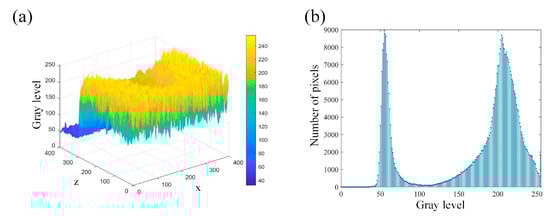 For the selected metallographic image, the preprocessing is conducted. The weld is selected as the center region of ROI and both of the w and h are set as 400. The obtained ROI image is shown in Figure 6a. After the grayscale image conversion, the corresponding grayscale image is shown in Figure 6b. From Figure 7a, it is clearly observed that the gray levels of weld zone are mainly distributed in the range of 160–220, and the gray levels of base material zone are mainly distributed in the range of 220–250. From Figure 7b, most of the gray levels of pixels are concentrated in the ranges of 50–100 and 150–250. According to Figure 7, the gray levels range of 50–100 correspond to the inlay material zone and the gray levels range of 150–250 correspond to the weld and base material zone. The grayscale image after filtering process is shown in Figure 8.