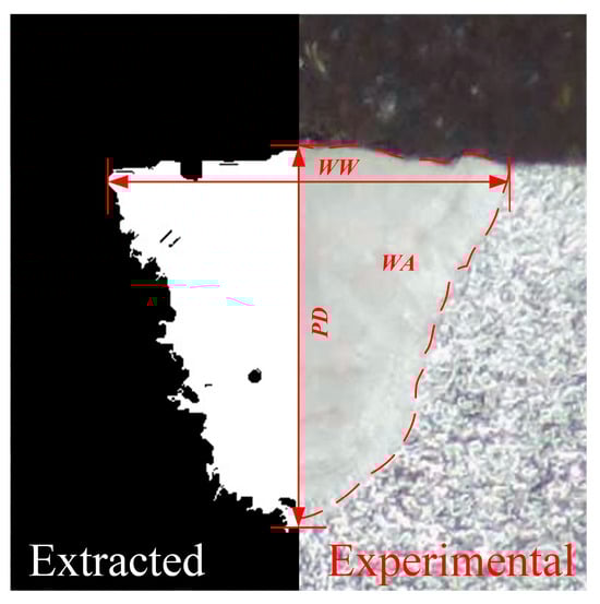 The extracted weld morphology is compared with the experimental weld morphology, as shown in Figure 10. It can be found that the extracted weld morphology agree well with the experimental weld morphology. The extracted weld morphology characteristics of the twenty-five weld samples are shown in Table 3.
