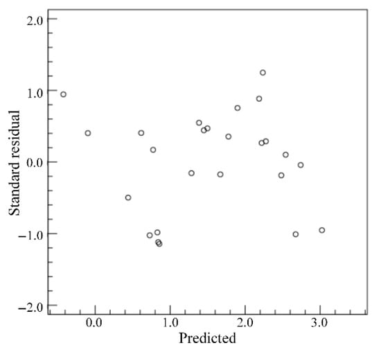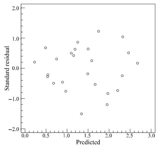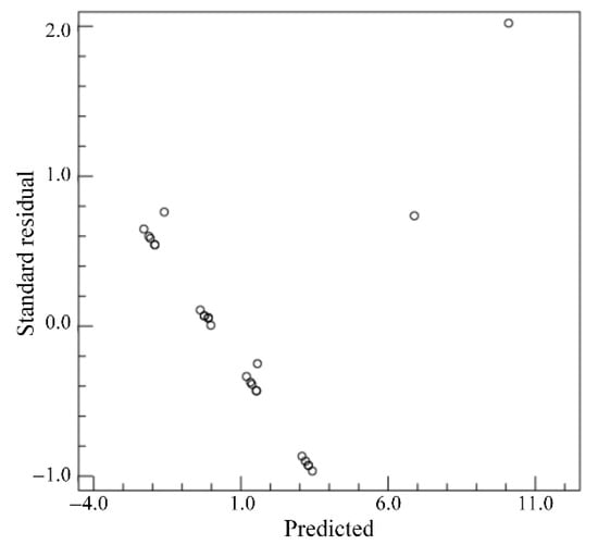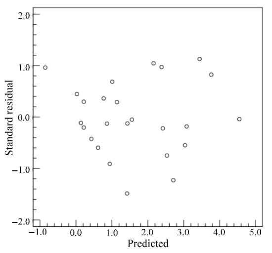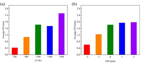 For the PD, the standard residuals are calculated when the dependent variable is PD, as shown in Figure 15. From Figure 15, the standard residuals are relatively uniformly distributed on both sides of 0, which indicates that the data meet the homogeneity of variance and can be used for multivariate analysis of variance. By setting the PD as the dependent variable and the LP, WS and DD as the impact factors, the test of intersubjective effects is conducted and the corresponding results are as shown in Table 7. From Table 7, the p values of LP and DD are less than 0.05, which indicates that the LP and DD have significant influences on the PD. Therefore, only the correlation analyses of LP and DD on the PD are conducted. The relationships between the average PD and the levels of factors are shown in Figure 16. From Figure 16, the average PD generally increases with the increase in LP and increases with the increase in DD. The difference between the maximum and minimum values in Figure 16a is larger than that in Figure 16b, which indicates that the significance of the influence of LP on the PD is higher than the significance of the influence of DD on the PD.