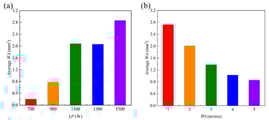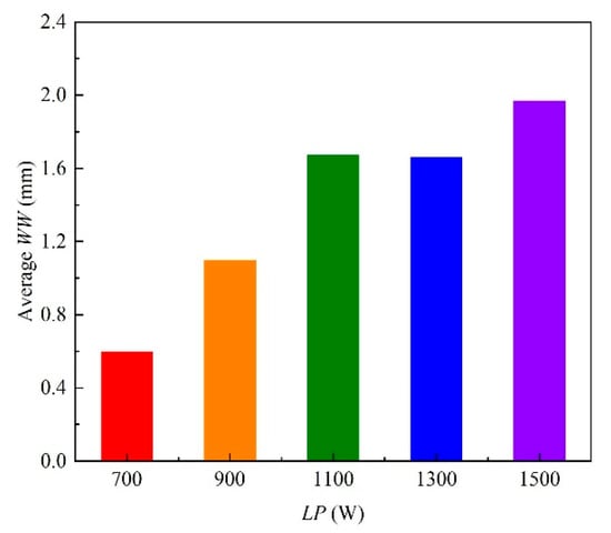 Based on the extracted weld morphology characteristics of twenty-five weld samples, the weld morphology characteristics under the conditions of the different welding process parameters are analyzed. For the WW, the standard residuals are calculated when the dependent variable is WW, as shown in Figure 13. From Figure 13, the standard residuals are relatively uniformly distributed on both sides of 0, which indicates that the data meet the homogeneity of variance and can be used for multivariate analysis of variance. By setting the WW as the dependent variable and the LP, WS and DD as the impact factors, the test of intersubjective effects is conducted and the corresponding results are as shown in Table 6. From Table 6, the p value of LP is less than 0.05, which indicates that the LP has a significant influence on the WW. The relationship between the average WW and the levels of LP is shown in Figure 14. The average WW is the average value of the WWs of a factor with a certain level. From Figure 14, it can be seen that the average WW generally increases with the increase in LP.
