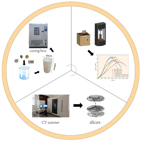 The experimental setup and equipment are illustrated in Figure 1. The primary equipment included a temperature-controlled curing chamber, a triaxial loading meter, and a CT scanner. The curing chamber was a GT-TH-800F constant-temperature and -humidity environmental test chamber, capable of operating within −40 °C to 150 °C for both constant and variable temperature conditions. The three-axis loading device was an RIST-416 multi-field coupled material mechanics testing machine, capable of performing both uniaxial and triaxial loading tests. The CT device was a nanoVoxel-4000 open-tube reflective high-penetration CT system, equipped with a 3000 kV microfocus X-ray source, providing high-resolution internal imaging with strong penetration. The curing chamber was manufactured by Gaotian Test Equipment Co., Ltd. (Wuhan, Hubei Province, China); the uniaxial loading apparatus by Ruist Testing Instruments Co., Ltd. (Changchun, Jilin Province, China); and the CT scanning equipment by Sanying Precision Instruments Co., Ltd. (Tianjin, China).