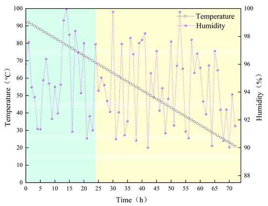 To investigate the effects of curing age, temperature, and fiber content on the mechanical performance of concrete, six test conditions were implemented across three casting batches: Batch 1: Fiber-free concrete cured at constant temperature. Six specimens were cast and cured at 20 ± 1 °C with 95 ± 5% relative humidity for 72 h. After 24 h, the end surfaces of the specimens were ground flat and smooth. They were then divided into two groups: three specimens underwent immediate uniaxial compression testing, while the other three continued curing before testing. Batch 2: Fiber-free concrete subjected to variable-temperature curing. Six specimens were cured from 92 °C to 20 °C over 72 h, with a controlled temperature decrease of 1 °C per hour. After 24 h of curing, the end surfaces of the specimens were ground flat and smooth. Subsequently, three specimens underwent immediate uniaxial compression testing, while the other three continued curing until reaching a total curing age of 72 h. The curing profile is illustrated in Figure 2. Batch 3: Steel fiber-reinforced concrete specimens subjected to identical variable-temperature curing conditions and end-surface grinding methodology as Batch 2. Post-loading, all specimens were CT scanned to reconstruct their internal crack structures.