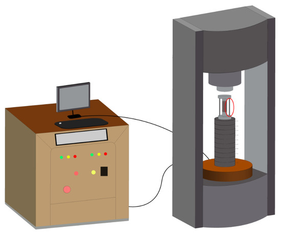 Uniaxial loading was conducted using the apparatus shown in Figure 3. A built-in mechanical limit rod (circle in red) was used to prevent actuator overrun during specimen failure, thereby protecting sensitive components such as the force and displacement sensors. The specimens were loaded under displacement control at a rate of 0.1 mm/min.