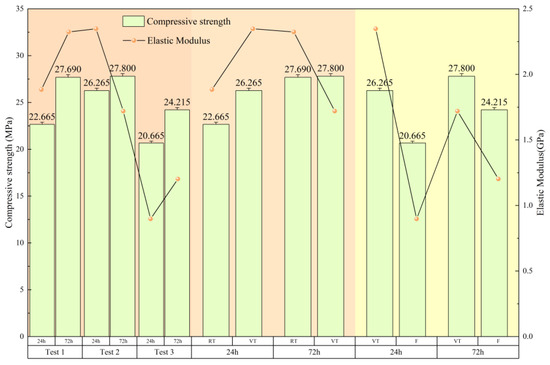 Compressive strength and elastic modulus. “Test 1,” “Test 2,” and “Test 3” refer to the RT, VT, and F groups, respectively.