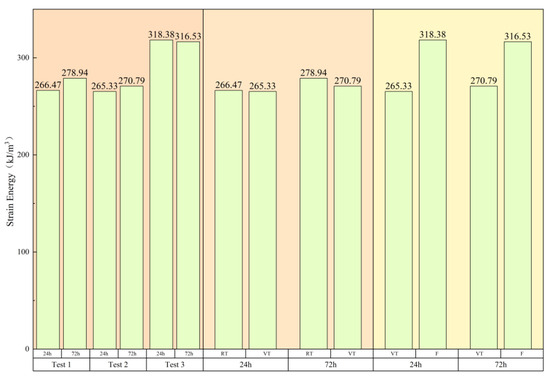 The left panel of Figure 8 presents the influence of hydration age on the three test groups. The RT group exhibited a 4.58% increase in energy absorption from 24 to 72 h, while the VT and F groups showed changes of 2.06% and −0.58%, respectively. These observations indicate the following: