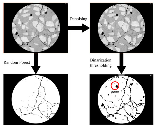 Due to the relatively low resolution of CT imaging, initial noise reduction was applied prior to threshold-based segmentation. However, cracks and pores often share similar grayscale values in the CT slices, rendering conventional thresholding ineffective for accurate crack extraction.