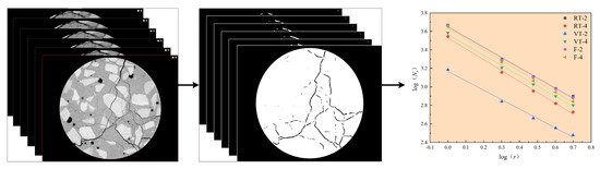 Based on fractal theory [30], the box-counting method was applied to these binary images to quantify the fractal dimensions of the crack networks. In this study, the 400th slice from each specimen was randomly selected for initial analysis. The calculated box-counting dimension values and corresponding fitting equations are presented in Table 2. The log–log plots of Nr versus r displayed strong linearity, with correlation coefficients (R2) approaching 1.0, confirming a robust fractal relationship between crack area and measurement scale. These findings demonstrate that cracks in concrete exhibit clear fractal characteristics.