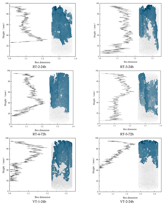 Distribution of box-counting dimensions along specimen height for different experimental conditions. In the figure, the black polyline on the left represents the box-counting dimension characteristics along the height direction of the specimen, while the right side shows the 3D CT reconstruction image of the corresponding specimen, with the blue area indicating the internal failure cracks of the specimen. Regarding the specimen naming convention (e.g., RT-1-24h): RT = curing condition (room temperature); 1 = specimen identification number; 24h = curing duration (24 h).