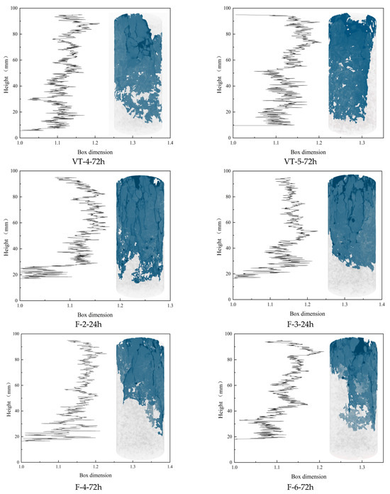 Figure 11 also highlights the non-uniform spatial distribution of cracks. Due to axial loading from the top surface, cracks predominantly developed in the upper regions of the specimens. To further investigate the evolution of fractal characteristics, the box-counting dimensions of slices from specimens under identical curing conditions were averaged, with the results presented in Figure 12. A general trend emerges: the fractal dimension increases initially, stabilizes across the mid-height range, and then decreases toward the base.