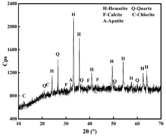 In this work, the cryptocrystalline oolitic hematite ore samples were collected from Enshi, Hubei province. Chemical phase analysis was carried out to determine the distribution of iron in the samples. Table 1 shows the iron distribution in the dominant mineral phases in the oolitic hematite ore. It was confirmed that the iron is mainly enriched in hematite (Fe2O3) and limonite. The iron content was 48.3 wt.%, accounting for 96.79% of the total iron in the oolitic hematite ore. The X-ray diffraction patterns of the oolitic hematite ore are shown in Figure 1. It was indicated that the dominant mineral in the oolitic hematite ore was hematite (Fe2O3), followed by small proportions of quartz, calcite, apatite, and chlorite.