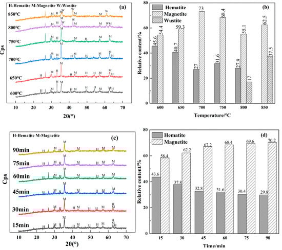 Figure 2 illustrates the mineral compositions and the relative content of hematite (Fe2O3) and magnetite of the roasted products at various sintering conditions. The effect of the sintering temperature on the phase transformation process was studied, and the results are shown in Figure 2a,b. The sintering time was fixed at 60 min. It was shown that, with an increase in the sintering temperature, the iron minerals were gradually reduced as the diffraction intensity and peak area of hematite (Fe2O3) was reduced, while the peak diffraction intensity and the content of magnetite were increased. Magnetite was formed at approximately 600 °C, and the content of magnetite reached maximum as the sintering temperature was 700 °C. As the sintering temperature was further increased, the peak intensity of magnetite and the magnetite content started decreasing, owing to the generation of FexO. At the sintering temperature of 850 °C, hematite (Fe2O3) was fully reduced and its content could not be detected. The iron minerals in the reduced product were transformed into magnetite and FexO. It was confirmed previously that the existence of FexO would cause the poor low-intensity magnetic separation efficiency of iron. Thus, 700 °C was the optimum sintering temperature for the recovery of magnetite.