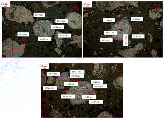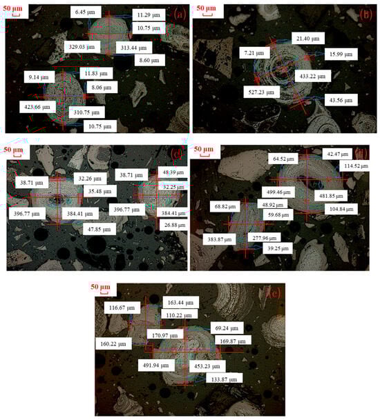 Figure 10 displays the microscopic images of cryptocrystalline oolitic hematite ore after being reduced at different sintering times at a sintering temperature of 800 °C. The thicknesses of the generated magnetite layer were calculated and are listed in Table 5. As the sintering time increased from 20 min to 40 min, the thickness of the generated magnetite layer was gradually increased from 33.84 μm to 48.43 μm. Subsequently, the thickness exhibited an accelerated growth rate, and the value increased to 68.91 μm as the sintering time was 60 min. At the same time, the relative thickness of the generated magnetite increased from 20.43% to 52.87% as the sintering time increased from 20 min to 60 min, which was positive with the variation in the magnetite thickness layer. Both the thickness and relative thickness of the magnetite layer confirmed successful hematite (Fe2O3) reduction without magnetite over-reduction at 800 °C, as long as the sintering time was properly regulated.