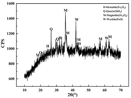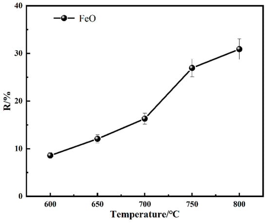 As observed in Table 3, the thickness of a generated magnetite particle increased from 9.52 μm to 76.76 μm with an increase in the sintering temperature from 600 °C to 750 °C, while the relative thickness was raised from 5.99% to 50.33%. Upon further increase in the sintering temperature to 800 °C, the thickness of magnetite particles decreased to 68.91 μm, while the relative thickness slightly increased to 52.87%. This was primarily because the generated Fe3O4 was further reduced to FeO at a higher sintering temperature, which was confirmed by the XRD patterns of the roasted products at 800 °C, as shown in Figure 5.