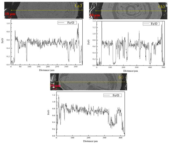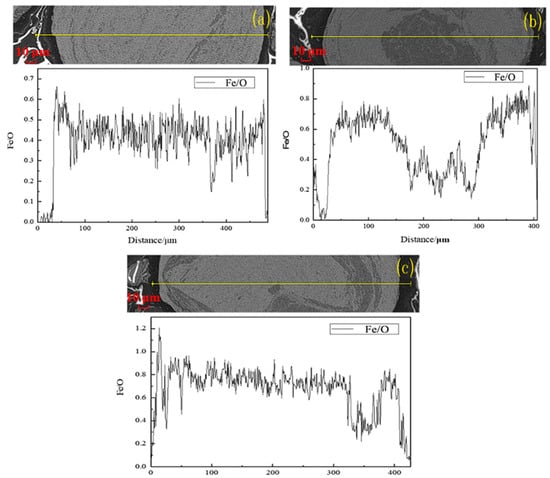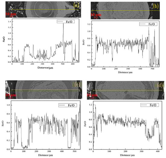 Besides the content of FeO, the Fe/O atomic ratio in the reduced products also can be used to characterize the grain growth of the newly generated magnetite particles. At the sintering temperature range for the generation of magnetite, a high Fe/O atomic ratio represented a high Fe2+ content, which further demonstrated a good reduction of hematite ore to magnetite. Although the Fe/O ratio can be a simplified indicator of the degree of reduction of magnetite, this method still has certain limitations. Iron in natural ores may exist in different mineral phases, such as iron silicate, apatite inclusions, etc., and its reduction path is different from that of pure iron oxide, which may affect the accuracy of the Fe/O ratio. Therefore, the use of the Fe/O ratio needs to be combined with mineral phase analysis and other physical property testing methods to obtain a more comprehensive and reliable evaluation result. SEM-EDS analysis with line scanning was conducted on the roasted products to analyze the variation in the Fe/O atomic ratio at different sintering conditions. The results are exhibited in Figure 7.