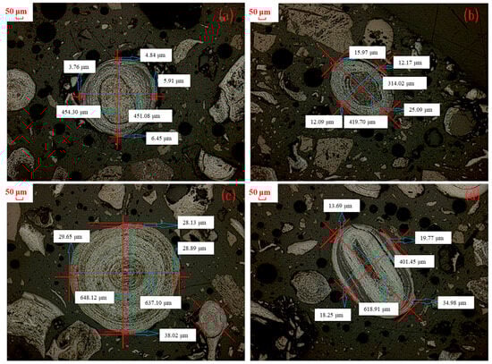 As the formation principle of magnetite has already been investigated in the above Section 3.1, the effect of sintering temperature and sintering time on the growth law of magnetite particles was studied in this section. Figure 4 presents microscopic images of the roasted products obtained from the magnetization process of the cryptocrystalline oolitic hematite ore at various temperatures with a sintering time of 60 min, sintering with coal. Due to the non-uniformity of the magnetite particle size, the thickness of the magnetite layer of single magnetite particles was not representative. The relative thickness of magnetite layer of different magnetite particles was thus calculated. Table 3 shows the statistical and calculation results regarding the thickness and relative thickness of the magnetite layer in the micrograph of the roasted product (with a statistical sample size of ≥50 magnetite particles).