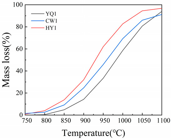 The reactivity test is the specific mass loss of char and CO2 under high temperature conditions of 1100 °C. The temperature-dependent reactivity profiles demonstrate distinct performance characteristics among the three char types (Figure 1). At lower temperatures (750–850 °C), all chars exhibit minimal reactivity, reflecting the activation energy requirements for carbon–CO2 gasification. However, as temperature increases beyond 900 °C, significant divergence emerges in their reactive behavior.