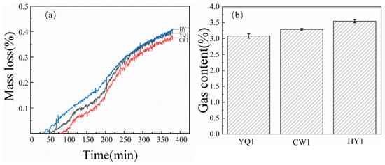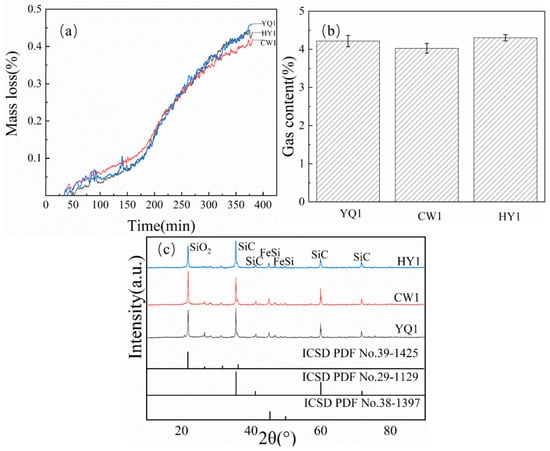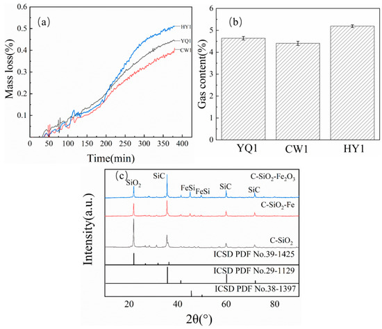 Three different systems of 1.5 g and 2.9 g SiO2 of char were placed in a crucible for the carbon silicon smelting reaction at 1500 °C. The mass loss of the reaction is shown in Figure 3a. And the gas content, such as CO, H2, etc., is shown in Figure 3b.