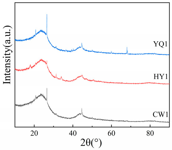 X-ray diffraction patterns reveal characteristic features of carbonaceous materials, with distinct gamma peaks at 2θ ≈ 21°, (002) peaks near 2θ ≈ 24°, and (100) peaks at approximately 2θ ≈ 44° (Figure 4). The gamma peak reflects the presence of aliphatic side chains and oxygen-containing functional groups within cyclic aromatic structures, whilst the 002 and 100 peaks represent aromatic layer stacking density and aromatic ring polymerization degree, respectively [14].