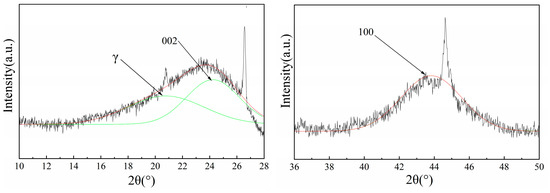 Using Origin2019b software for peak fitting, the peak position 2θ, peak width at half maximum, peak area, and other related data can be obtained from the peak fitting graph. The aromatic interlayer spacing d002, aromatic cluster size Lc, La, and other data can be calculated using Scherrer Formulas (1) and (2) and Bragg Formula (3) [11,12].