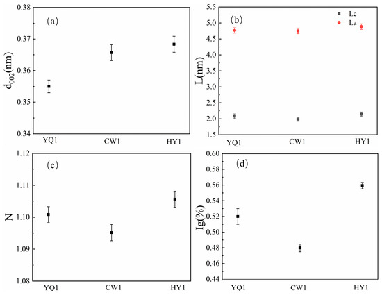 Carbon structure of char. (a) d002 with different half focal lengths, (b) different half focal lengths Lc and La, (c) different half focal lengths N, and (d) different half focal lengths Ig.