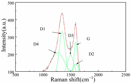 Spectral deconvolution identifies five characteristic bands following peak fitting procedures (Figure 7). D1 peaks are attributed to heteroatoms on carbon crystal surfaces, D2 peaks represent structural defects in carbon microcrystals, D3 peaks indicate amorphous carbon presence, D4 peaks are from multiple olefin structures, and G peaks represent ideal graphitic crystalline regions [18].