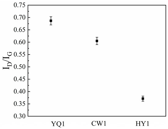 The intensity ratio ID/IG serves as an important parameter for assessing structural defect density and crystalline ordering. This ratio provides direct insight into char quality, where lower values indicate microcrystalline arrangement and enhanced reactivity potential. The lower the ratio of ID/IG, the fewer microcrystal defects and denser the arrangement inside the blue charcoal. Among the three char types we examined, HY1 char exhibits the lowest ID/IG ratio (0.37), indicating minimal internal microcrystalline defects (for example: in-plane incompleteness of carbon microcrystals, irregular structural arrangement of carbon microcrystals, etc.), elevated ideal graphite content, and superior reactivity potential (Figure 8) [19]. This reduced defect density correlates directly with the enhanced orderliness observed in XRD analysis and confirms the high-quality microcrystalline structure within HY1 char.