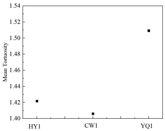 The processed images in Figure 9 reveal distinct differences in lattice fringe tortuosity among the three char types, as shown in Figure 10. HY1 char demonstrates the lowest mean tortuosity value, indicating highly ordered internal grain structure with minimal structural distortion. This reduced tortuosity correlates directly with improved orderliness and enhanced reactivity, consistent with previous characterization results.