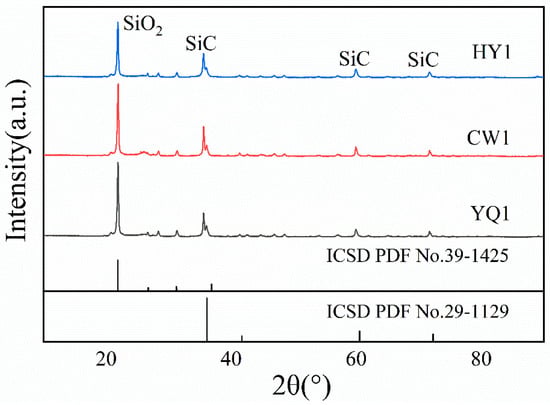 XRD characterization of ground reaction products reveals distinct phase compositions that directly correlate with char performance in silicon dioxide thermal reduction (Figure 12). SiC peaks appear at 2θ = 36°, 61°, and 72° [23,24], whilst residual SiO2 peaks at 2θ = 23° provide quantitative evidence of reaction completeness. Peak intensity analysis demonstrates significant conversion efficiency differences among char types, with relative intensity ratios of HY1:YQ1:CW1 of approximately 1.307:1.173:1 (Table 3).