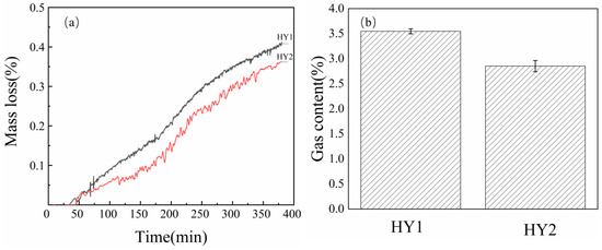 Mass loss analysis (Figure 13a) demonstrates that HY1 char achieves superior conversion efficiency compared to HY2, with final mass loss rates of approximately 0.42% versus 0.38%, respectively. This enhanced reactivity correlates with the more controlled structural development achieved through slower heating rates, which facilitates optimal aromatic layer organization and reduces defect formation. Gas chromatography analysis (Figure 13b) confirms this trend, showing significantly higher CO and H2 generation for HY1 char, indicating more complete participation in the reduction reaction.
