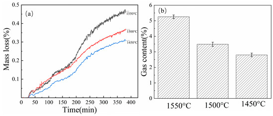 Corresponding gas evolution data (Figure 16b) reveals systematic CO production increases with temperature, confirming enhanced carbon consumption. At 1550 °C, gas generation reached 5.8%, substantially exceeding 3.7% at 1450 °C, which is a 56.8% increase indicating more complete carbon participation in reduction reactions.